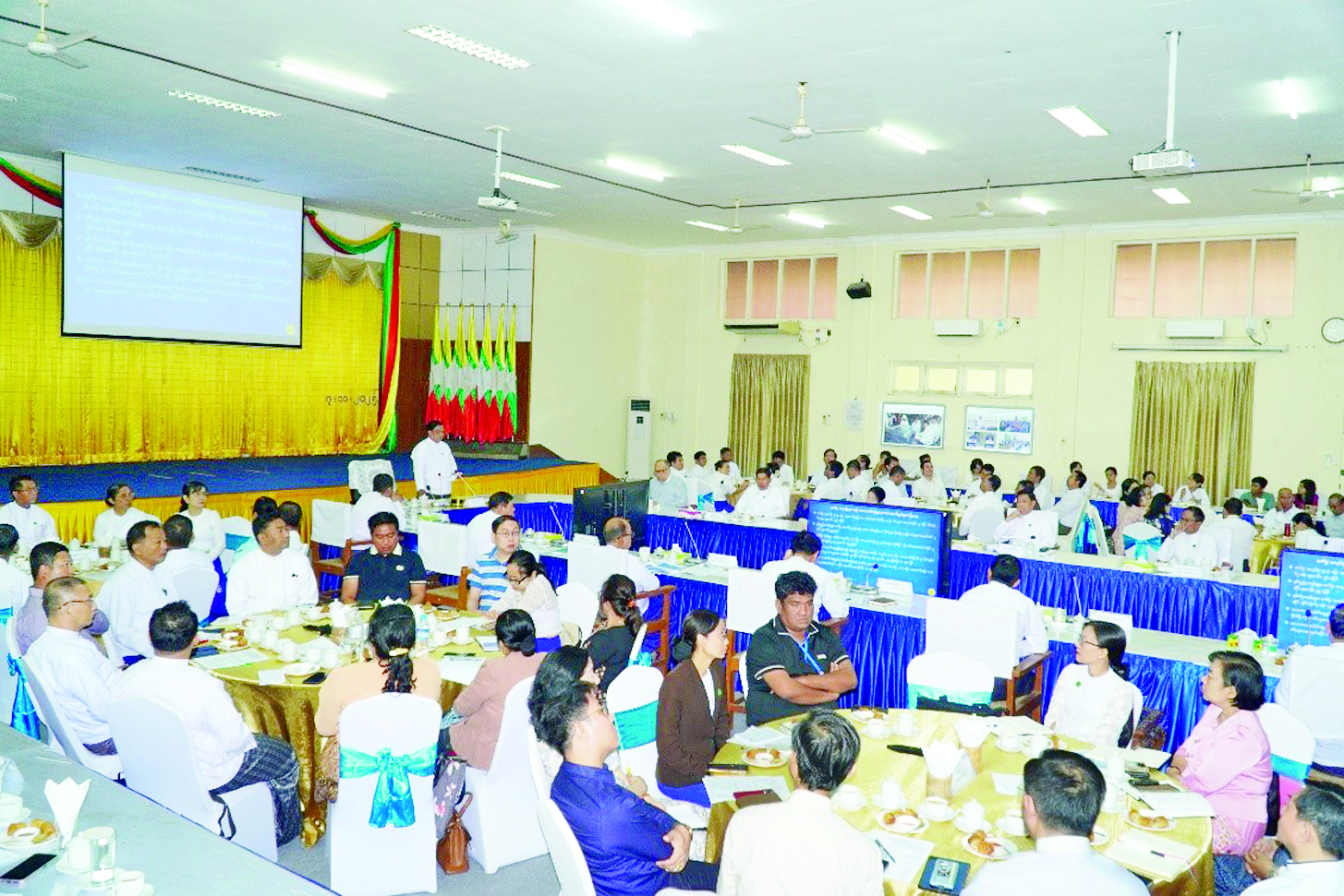 ပုဂ္ဂလိကနှင့် ငှားရမ်း/ ဖက်စပ်/ အကျိုးတူဆောင်ရွက်နေသည့် စက်ရုံများထုတ်လုပ်မှု တိုးတက်စေရေးအတွက် ဆက်လက်ဆောင်ရွက်သင့်သည့် မူဝါဒချမှတ်ရန်နှင့် ဆောင်ရွက်ရမည့်အစီအမံများ ရေးဆွဲရေး အကြိုညှိနှိုင်းအစည်းအဝေးကို ယနေ့နံနက်ပိုင်းတွင် စက်မှုဝန်ကြီးဌာန ရုံးအမှတ်(၃၀) အစည်းအဝေးခန်းမ၌ ကျင်းပသည်။