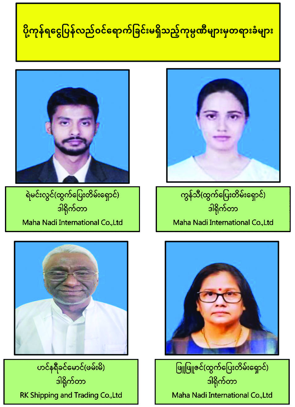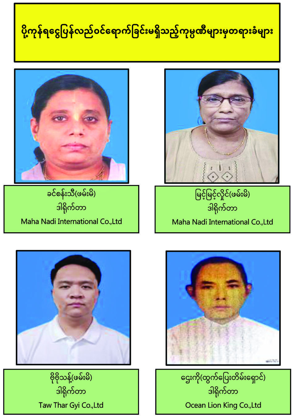 သို့ဖြစ်၍ ပြည်ပသို့ပို့ကုန်များတင်ပို့ခဲ့ပြီး ပို့ကုန်ရငွေပြန်လည် ဝင်ရောက်ခြင်းမရှိခဲ့သည့် ကုမ္ပဏီများမှ တာဝန်ရှိသူများဖြစ်သည့် ဦးရဲမင်းလွင် (ထွက်ပြေးတိမ်းရှောင်)၊ ဒေါ်ကွန်သီ (ထွက်ပြေးတိမ်းရှောင်)၊ ဒေါ်ဖြူဖြူဇင် (ထွက်ပြေးတိမ်းရှောင်)၊ ဒေါ်မြင့်မြင့်လှိုင် (ဖမ်းမိ)၊ ဒေါ်ခင်စန်းသီ (ဖမ်းမိ)၊ ဦးဟင်နရီခင်မောင် (ဖမ်းမိ)၊ ဦးဗိုဗိုသန့် (ဖမ်းမိ) နှင့် ဦးဌေးကို (ထွက်ပြေးတိမ်းရှောင်) တို့ ရှစ်ဦးနှင့် အသင်းမှ တာဝန်ရှိသူများကို ရုန့်ရင်းကြမ်းတမ်းစွာ ဆဲဆိုခြင်း၊ အသက်အန္တရာယ်ခြိမ်းခြောက်ခြင်းများ ဆောင်ရွက်ခဲ့သူ ဦးရဲမင်းလွင် (ထွက်ပြေးတိမ်းရှောင်) တို့အပေါ် ၎င်းတို့ကျူးလွန်ခဲ့သည့် ပြစ်မှုများအလိုက် ထိရောက်စွာ အရေးယူသွားမည်ဖြစ်ကြောင်း သိရသည်။
