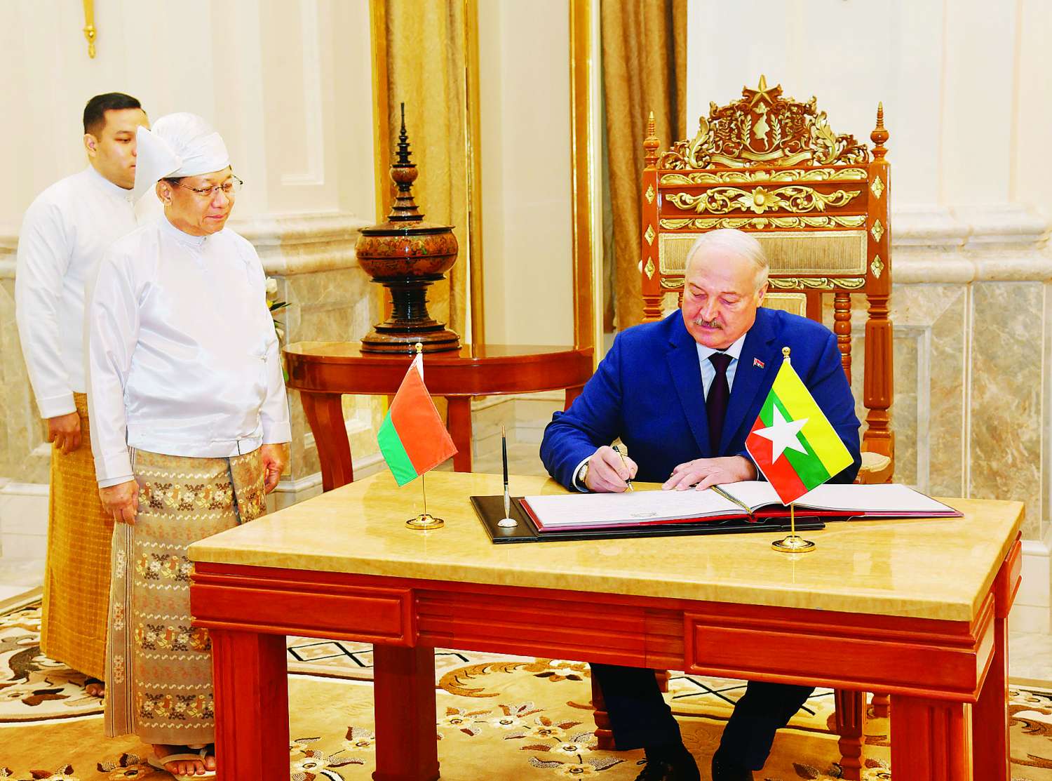 ပြည်ထောင်စုသမ္မတမြန်မာနိုင်ငံတော်ယာယီသမ္မတ နိုင်ငံတော်လုံခြုံရေးနှင့်အေးချမ်းသာယာရေးကော်မရှင်ဥက္ကဋ္ဌ ဗိုလ်ချုပ်မှူးကြီး မင်းအောင်လှိုင်သည် မြန်မာနိုင်ငံသို့ တရားဝင်ချစ်ကြည်ရေးခရီး ရောက်ရှိလာသော ဘယ်လာရုစ်သမ္မတနိုင်ငံသမ္မတ H.E. Mr. Aleksandr Lukashenko အား ယနေ့နံနက်ပိုင်းတွင် သမ္မတအိမ်တော် ဆင်ဖြူတော်ဆောင်ဧည့်ခန်းမ၌ ဂုဏ်ပြုတပ်ဖွဲ့ဖြင့် ကြိုဆိုသည်။