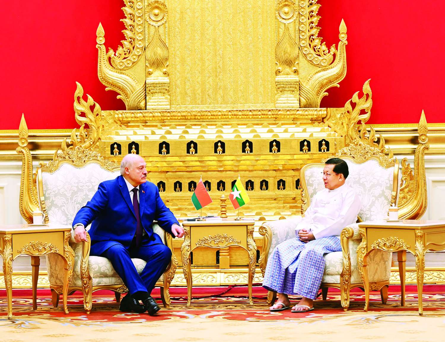 ထို့နောက် နိုင်ငံတော်ယာယီသမ္မတ နိုင်ငံတော်လုံခြုံရေးနှင့်အေးချမ်းသာယာရေးကော်မရှင်ဥက္ကဋ္ဌနှင့် ဘယ်လာရုစ်သမ္မတနိုင်ငံသမ္မတတို့သည် နှစ်နိုင်ငံအကြား စီးပွားရေးဆိုင်ရာ ပူးပေါင်းဆောင်ရွက်မှုများနှင့် ရင်းနှီးမြှုပ်နှံမှုများကို ဆက်လက်တိုးမြှင့် ဆောင်ရွက်သွားနိုင်မည့်အခြေအနေများ၊ ပညာရေး၊ ကျန်းမာရေး၊ စက်မှု၊ စိုက်ပျိုးမွေးမြူရေးနှင့် စစ်ဘက်နည်းပညာဆိုင်ရာစသည့် နယ်ပယ်အသီးသီးတွင် ပူးပေါင်းဆောင်ရွက်မှုများကို မြှင့်တင်ဆောင်ရွက်သွားမည့်အခြေအနေများ၊ မြန်မာနိုင်ငံအစိုးရအနေဖြင့် နိုင်ငံတကာနှင့် တစ်ကမ္ဘာလုံးကို အန္တရာယ်ပေးနေသည့် အွန်လိုင်းလိမ်လည်မှုများ၊ အွန်လိုင်းလောင်းကစားမှုများ တိုက်ဖျက်ရေးလုပ်ငန်းစဉ်များကို အမျိုးသားရေးတာဝန်တစ်ရပ်အနေဖြင့် အလေးထားတိုက်ဖျက်ဆောင်ရွက်လျက်ရှိမှု၊ ယခုအခါ မြန်မာ-ထိုင်းနယ်စပ်တွင်ရှိနေသည့် Online လောင်းကစားမှုများသည် သမားရိုးကျမဟုတ်သည့် လုံခြုံရေးဆိုင်ရာစိန်ခေါ်ချက်ဖြစ်သဖြင့် သတိထားဆောင်ရွက်လျက်ရှိမှု၊ ၎င်းလုပ်ငန်းသည် ကိုဗစ်-၁၉ ကာလနောက်ပိုင်း ၂၀၂၀ ပြည့်နှစ်မှ စတင်ကျယ်ပြန့်လာမှု၊ ၂၀၂၁ ခုနှစ် မြန်မာနိုင်ငံတွင် နိုင်ငံရေးမတည်ငြိမ်မှုဖြစ်လာချိန်၌ နယ်စပ်ဒေသများတွင် တည်ငြိမ်မှုနှင့် တရားဥပဒေစိုးမိုးမှုလျော့နည်းလာသည်ကို အခွင့်ကောင်းယူပြီး တရားမဝင်လက်နက်ကိုင်အဖွဲ့များနှင့်ပူးပေါင်း၍ အွန်လိုင်းလောင်းကစားမှုကို အခြေချခဲ့မှု၊ အွန်လိုင်းလောင်းကစားမှုပြုလုပ်သည့်နေရာများမှ ဖမ်းဆီးရမိသူ နိုင်ငံပေါင်း ၅၂ နိုင်ငံမှ ပြည်ပနိုင်ငံသား ၇၀၀၀၀ နီးပါးခန့်ကို ထိန်းသိမ်း၍ မိခင်နိုင်ငံသို့ပြန်ပို့လျက်ရှိမှု၊ ကျန်ရှိသည့်ပြည်ပနိုင်ငံသား ၁၀၀၀ ခန့်ကိုလည်း ပြန်ပို့ရန် ဆောင်ရွက်လျက်ရှိမှုနှင့် အွန်လိုင်းလိမ်လည်လောင်းကစားမှုများ လုံးဝပြန်လည်အခြေမချနိုင်စေရေး၊ ဒုစရိုက်လုပ်ငန်းများ ထပ်မံမလုပ်ဆောင်နိုင်စေရေးအတွက် တရားမဝင်ဆောက်လုပ်ထားသည့် အဆောက်အအုံများကိုလည်း အပြီးတိုင်ဖျက်ဆီးဖြိုချမှုများ ဆောင်ရွက်လျက်ရှိပြီး အမြစ်ပြတ်ချေမှုန်းသွားမည့်အခြေအနေများ၊ မြန်မာနိုင်ငံတွင် ပါတီစုံဒီမိုကရေစီအထွေထွေရွေးကောက်ပွဲတစ်ရပ်ကို မကြာမီကာလအတွင်း ကျင်းပပြုလုပ်သွားမည်ဖြစ်ပြီး ဘယ်လာရုစ်နိုင်ငံမှလည်း လေ့လာစောင့်ကြည့်ရေးအဖွဲ့ စေလွှတ်သွားမည့်အခြေအနေများ၊ နှစ်နိုင်ငံအကြား ချစ်ကြည်ရင်းနှီးမှုနှင့် ပူးပေါင်းဆောင်ရွက်မှုများကို ကဏ္ဍပေါင်းစုံ၌ ဆက်လက်တိုးမြှင့်ဆောင်ရွက်သွားမည့်အခြေအနေများနှင့်စပ်လျဉ်း၍ ရင်းနှီးပွင့်လင်းစွာ အမြင်ချင်းဖလှယ်ဆွေးနွေးကြသည်။