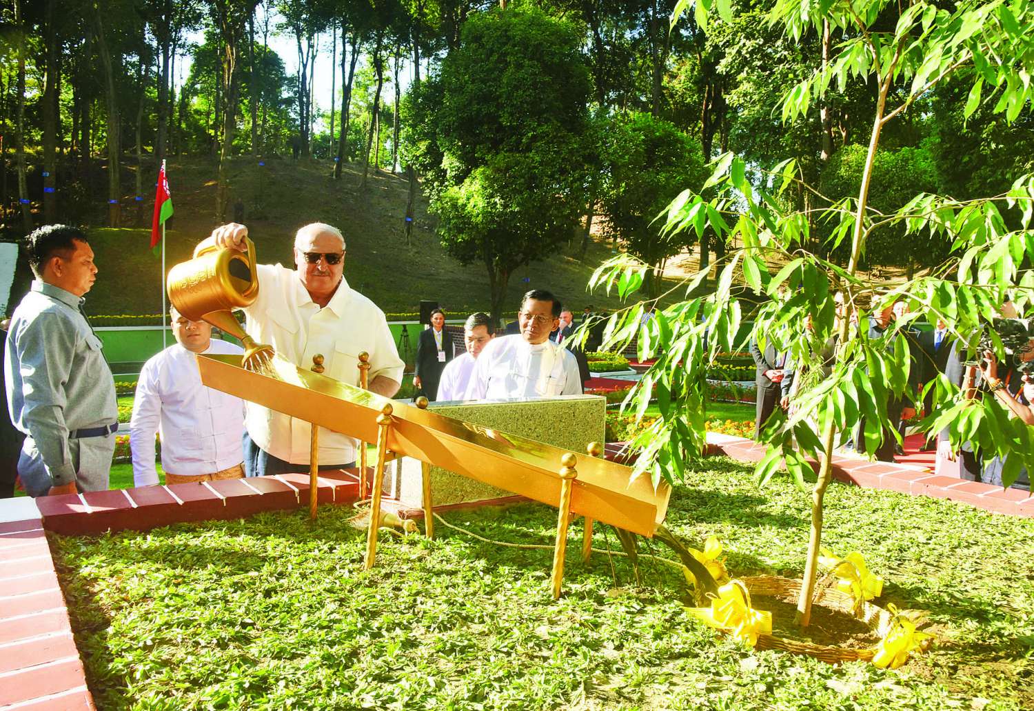 ပြည်ထောင်စုသမ္မတမြန်မာနိုင်ငံနှင့် ဘယ်လာရုစ်သမ္မတနိုင်ငံတို့အကြား နှစ်နိုင်ငံ သံတမန်ချစ်ကြည်ရင်းနှီးမှုအဓွန့်ရှည်တည်တံ့စေရန် ရည်ရွယ်၍ နှစ်နိုင်ငံအထိမ်းအမှတ် သစ်ပင်စိုက်ပျိုးပွဲကို ယနေ့မွန်းလွဲပိုင်းတွင် နေပြည်တော်၊ ဇမ္ဗူသီရိမြို့နယ် ပျဉ်းမနား-တောင်ညိုကားလမ်းဘေးရှိ ကျန်းမာရေးဝန်ကြီးဌာန၊ တိုင်းရင်းဆေးပညာဦးစီးဌာန နေပြည်တော် အမျိုးသားပရဆေးဥယျာဉ်၌ ကျင်းပပြုလုပ်ရာ မြန်မာနိုင်ငံ၌ တရားဝင်ချစ်ကြည်ရေးခရီး ရောက်ရှိနေသည့် ဘယ်လာရုစ်သမ္မတနိုင်ငံသမ္မတ H.E. Mr. Aleksandr Lukashenko နှင့် ပြည်ထောင်စုသမ္မတမြန်မာနိုင်ငံတော်ယာယီသမ္မတ နိုင်ငံတော်လုံခြုံရေးနှင့်အေးချမ်းသာယာရေးကော်မရှင်ဥက္ကဋ္ဌ ဗိုလ်ချုပ်မှူးကြီး မင်းအောင်လှိုင်တို့ တက်ရောက်၍ ကံ့ကော်ပင်ကို အတူတကွစိုက်ပျိုးပေးကြသည်။