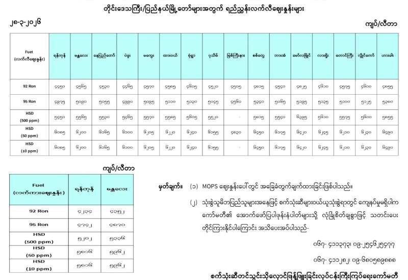 ရန်ကုန်မြို့နှင့် မန္တလေးမြို့အတွက် ရည်ညွှန်းလက်ကားဈေးနှုန်းများနှင့် ပြည်ထောင်စုနယ်မြေ နေပြည်တော်၊ တိုင်းဒေသကြီး/ပြည်နယ် မြို့တော်များအတွက် ရည်ညွှန်းလက်လီဈေးနှုန်းများ 12/01/2025