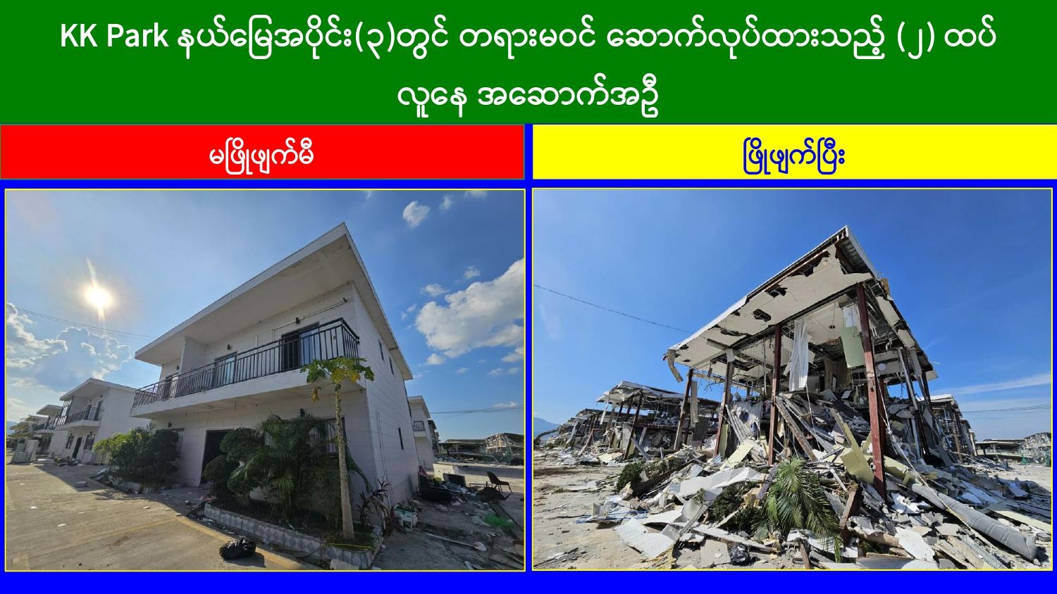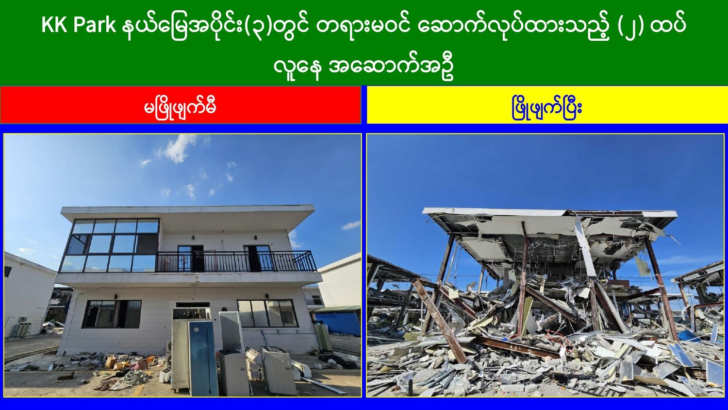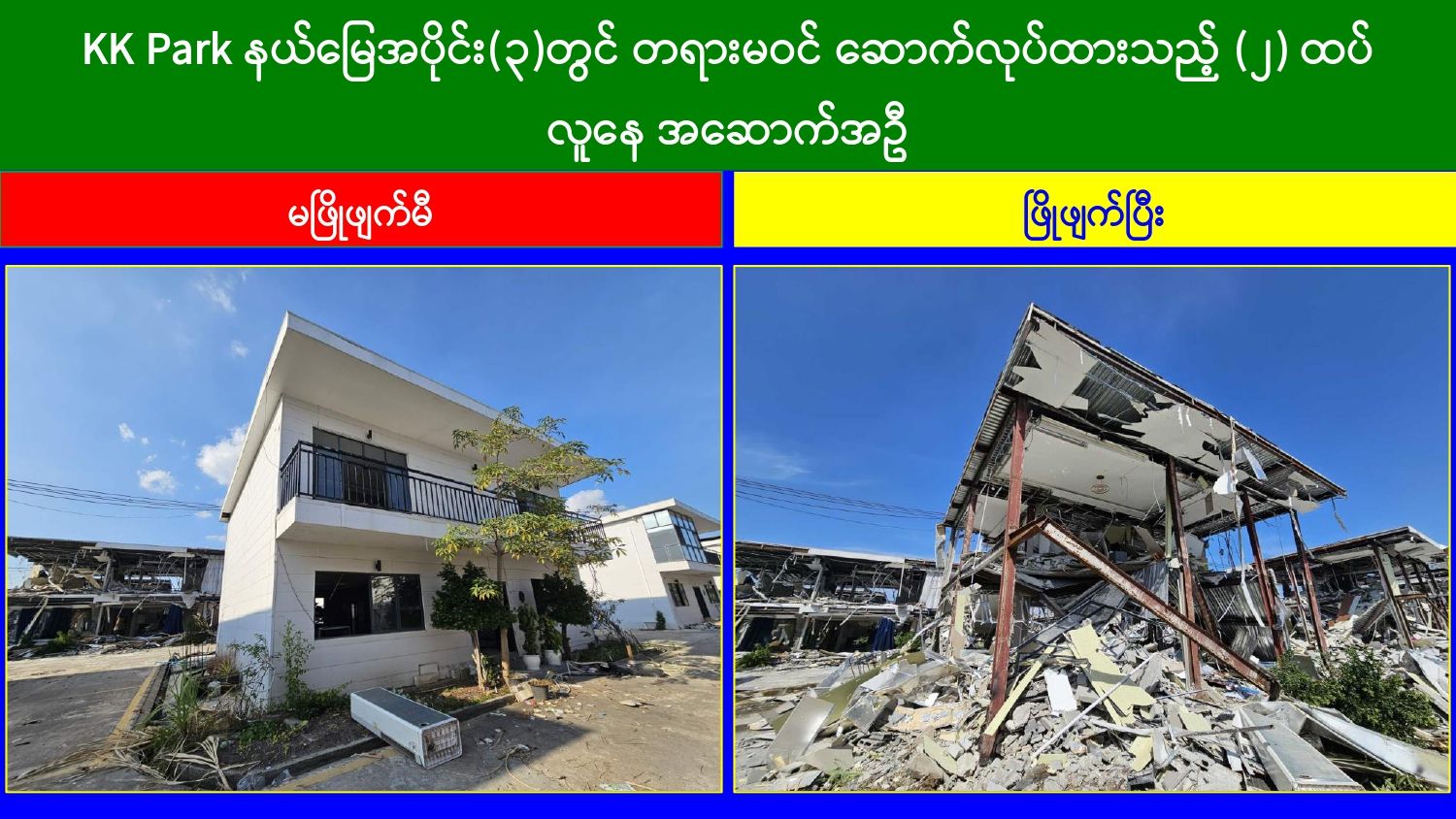 ထိုသို့ အွန်လိုင်းလိမ်လည်လောင်းကစားမှုတိုက်ဖျက်ရေး လုပ်ငန်းများဆောင်ရွက်လျက်ရှိရာ ယနေ့တွင် မြဝတီ-မဲ့ထော်သလေး (KK Park) နယ်မြေအတွင်းရှိ အွန်လိုင်းလိမ်လည်လောင်းကစားမှုများ ကျူးလွန်ရာတွင် အသုံးပြုခဲ့သည့် အပိုင်း(၃) နယ်မြေအတွင်းရှိ တရားမဝင် ၄ ထပ်အဆောက်အအုံ ၂ လုံးနှင့် ၂ ထပ်အဆောက်အအုံ ၁၀ လုံး၊ စုစုပေါင်း တရားမဝင်အဆောက်အအုံ ၁၂ လုံးကို ထပ်မံဖြိုချဖျက်ဆီးခဲ့သဖြင့် KK Park နယ်မြေအတွင်းရှိ တရားမဝင်အဆောက်အအုံ စုစုပေါင်း ၆၃၅ လုံး အနက် ၃၃၃ လုံးကို စနစ်တကျ ဖြိုချဖျက်ဆီးပြီးဖြစ်ကြောင်း သိရှိရသည်။