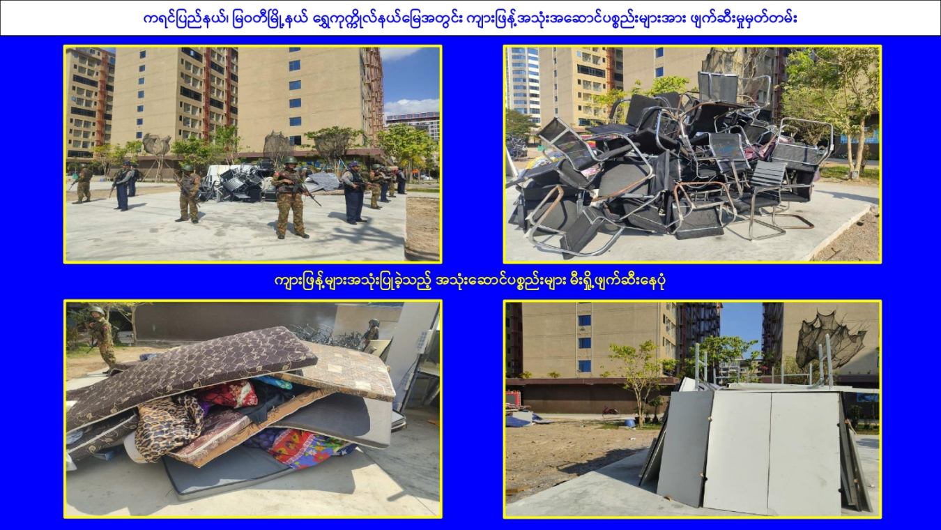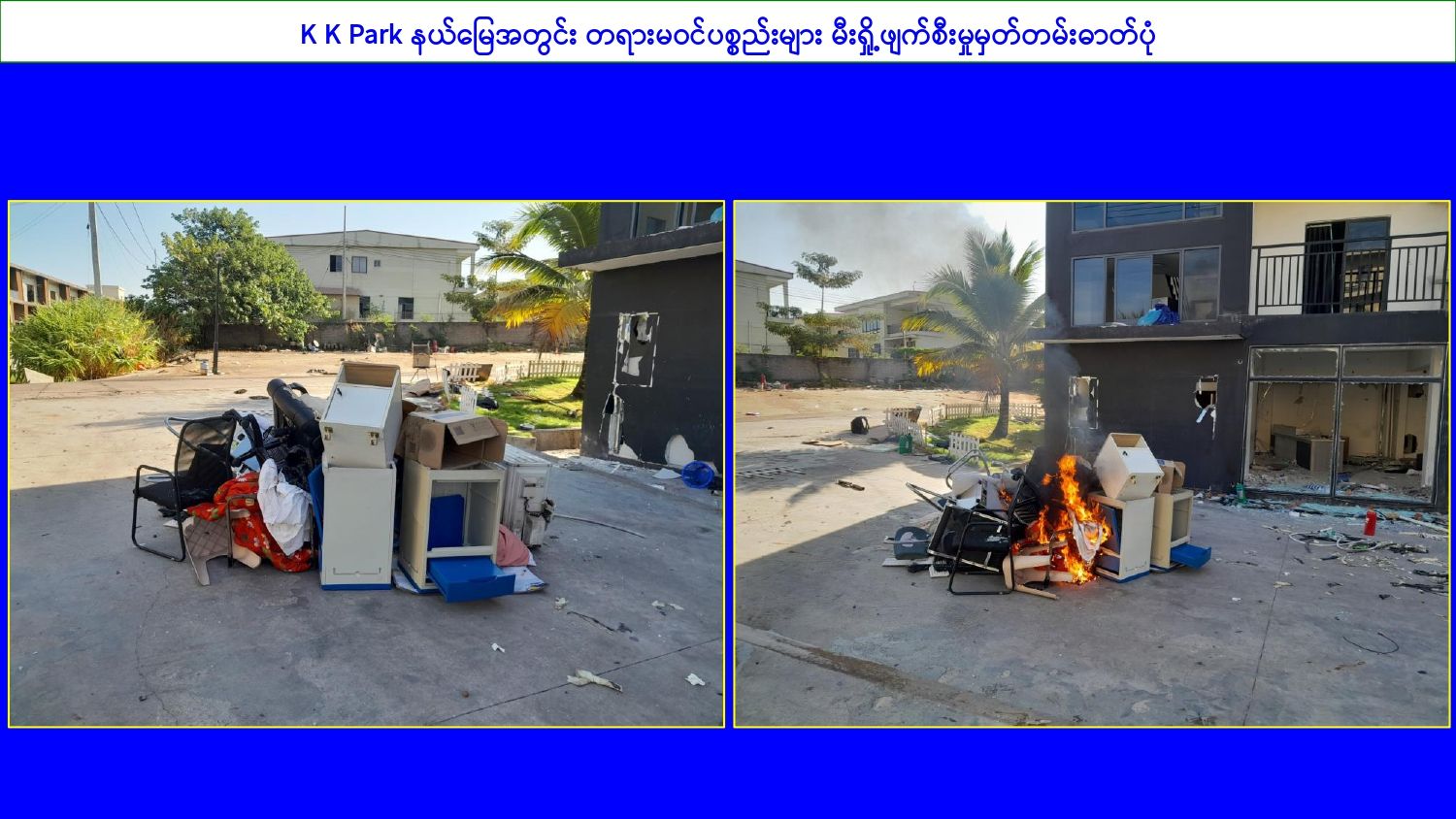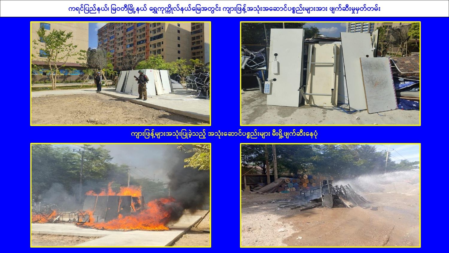 ထို့ပြင် KK park နယ်မြေနှင့် ရွှေကုက္ကိုလ်နယ်မြေတို့ရှိ အွန်လိုင်းလိမ်လည်လောင်း ကစားမှုကျူးလွန်ရာတွင်အသုံးပြုခဲ့သည့် ပစ္စည်းများအား ထပ်မံအသုံးပြုမှုမရှိစေရေးအတွက် ယနေ့တွင်လည်း စနစ်တကျမီးရှို့ဖျက်ဆီးခဲ့ကြောင်း၊ အဆိုပါ နယ်မြေများရှိ ဖမ်းဆီးထိန်းသိမ်းထားရှိသည့် တရားမဝင်ပြည်ပနိုင်ငံသားများကို တရားမဝင်ပြည်ပနိုင်ငံသား စစ်ဆေးရေးအဖွဲ့က စစ်ဆေး၍ သက်ဆိုင်ရာနိုင်ငံများသို့ အမြန်ဆုံးပြန်လည်လွှဲပြောင်းပေးနိုင်ရေးအတွက် ဌာနဆိုင်ရာပူးပေါင်းအဖွဲ့များဖြင့် လိုအပ်သည့် ကိုယ်ရေးအချက်အလက်များနှင့် မှတ်တမ်းများ စာရင်းကောက်ယူခြင်းလုပ်ငန်းများ ဆောင်ရွက်ပေးလျက်ရှိကြောင်း သိရှိရသည်။