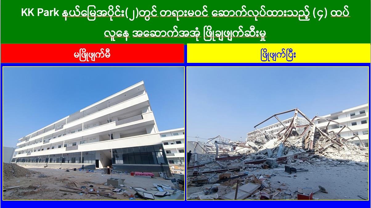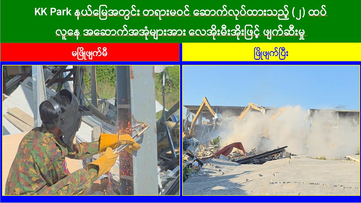 မြန်မာနိုင်ငံအစိုးရအနေဖြင့် အွန်လိုင်းလိမ်လည်လောင်းကစားမှုများ အများဆုံးအခြေချလုပ်ကိုင်လျက်ရှိကြသည့် ရွှေကုက္ကိုလ်နယ်မြေနှင့် KK Park နယ်မြေများရှိ တရားမဝင် အဆောက်အအုံများအတွင်း ဝင်ရောက်ရှင်းလင်း၍ အွန်လိုင်းလိမ်လည်လောင်းကစားမှုလုပ်ငန်းစဉ်များတွင် အသုံးပြုခဲ့သည့် သိမ်းဆည်းရမိပစ္စည်းများအား စနစ်တကျ ဖျက်ဆီးခြင်းနှင့် တရားမဝင်အဆောက်အအုံများအား စနစ်တကျဖြိုချဖျက်ဆီးခြင်းများကို အဖွဲ့စုံပါဝင်သည့် ပူးပေါင်းအဖွဲ့ဖြင့် ဆောင်ရွက်လျက်ရှိရာ ယနေ့တွင်လည်း KK Park နယ်မြေအတွင်းရှိ တရားမဝင်အဆောက်အအုံ ၆ လုံးကို ထပ်မံဖြိုချဖျက်ဆီးခဲ့ကြောင်း သိရှိရသည်။