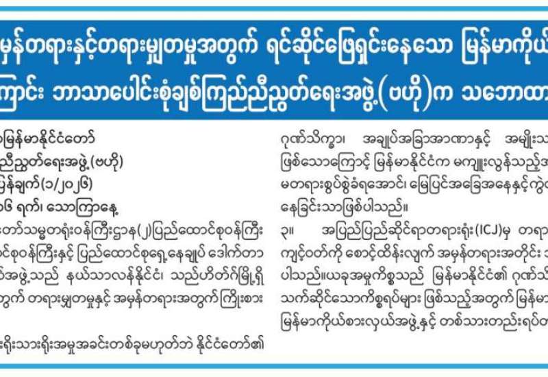 အပြည်ပြည်ဆိုင်ရာတရားရုံးတွင် ဂမ်ဘီယာနိုင်ငံနှင့် မြန်မာနိုင်ငံတို့၏အမှုနှင့်ပတ်သက်၍ ကြားနာပွဲကို ဇန်နဝါရီ ၁၂ ရက်မှ ၂၉ ရက်နေ့အထိ နယ်သာလန်နိုင်ငံ သည်ဟိတ်ဂ်မြို့၌ ပြုလုပ်လျက်ရှိရာ မြန်မာနိုင်ငံမှ ပထမအကြိမ်လျှောက်လဲခြင်းကို ဇန်နဝါရီ ၁၆ ရက်က ပြုလုပ်ခဲ့ရာတွင် မြန်မာနိုင်ငံ၏ကိုယ်စားလှယ် နိုင်ငံတော်သမ္မတရုံးဝန်ကြီးဌာန (၂) ပြည်ထောင်စုဝန်ကြီးက ဂမ်ဘီယာနိုင်ငံ၏ စွပ်စွဲချက်များကို တိတိကျကျ မှန်မှန်ကန်ကန် ရှင်းရှင်းလင်းလင်း ခုခံကာကွယ်ပြောကြားခဲ့သည်။