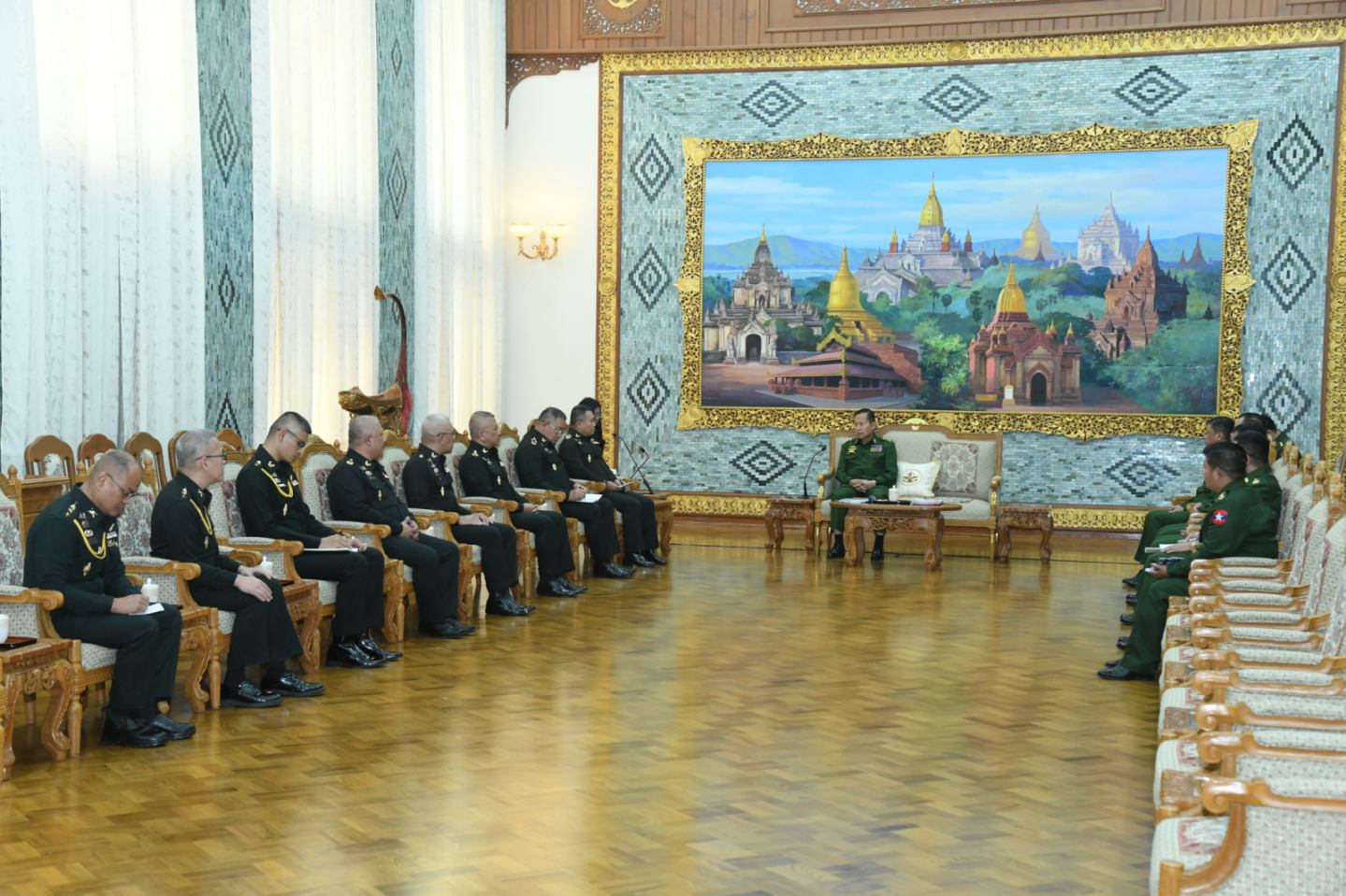 နိုင်ငံတော်လုံခြုံရေးနှင့်အေးချမ်းသာယာရေးကော်မရှင်ဒုတိယဥက္ကဋ္ဌ ဒုတိယတပ်မတော်ကာကွယ်ရေးဦးစီးချုပ် ကာကွယ်ရေးဦးစီးချုပ် (ကြည်း) ဒုတိယဗိုလ်ချုပ်မှူးကြီး စိုးဝင်း ထိုင်းဘုရင့်ကြည်းတပ်ဦးစီးချုပ်ရုံး Army Operation Center ၊ Neighboring Countries Coordination Center (NCCC) ဌာန၏ အကြီးအကဲ ဦးဆောင်သည့် ကိုယ်စားလှယ်အဖွဲ့အား လက်ခံတွေ့ဆုံ