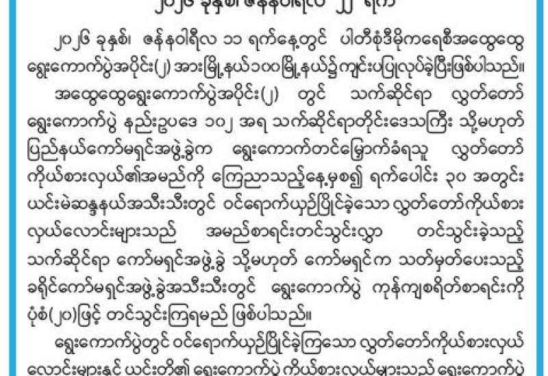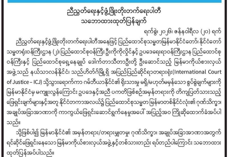 “သမဂ္ဂါနံ တပေါ သုခေါ” ညီညွတ်သူတို့၏ အကျင့်သည် ချမ်းသာကြောင်းဖြစ်သည်ဟု မြတ်စွာဘုရား ဟောကြားတော်မူခဲ့သည်။ ကိုယ်စိတ်နှစ်ဖြာ ချမ်းသာခြင်းကို မိမိတို့အားလုံး မည်မျှလိုချင်ကြသည်ဖြစ်စေကာမူ မညီညွတ်ခြင်းကြောင့် မချမ်းသာ။ အလုံးစုံသောညီညွတ်မှုကို အတူတကွ ပူးပေါင်းညီညာ မတည်ဆောက်နိုင်သရွေ့ မချမ်းသာ။