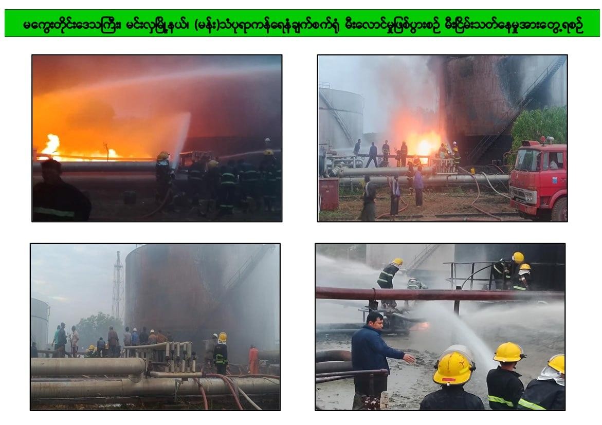 မကွေးတိုင်းဒေသကြီး၊ မင်းလှမြို့နယ်ရှိ ရေနံဓာတုဗေဒစက်ရုံစု(သံပရာကန်)၌ ယနေ့နံနက် ၆ နာရီ၊ ၅ မိနစ်ခန့်တွင် စတင်မီးလောင်ကျွမ်းမှုဖြစ်ပွားခဲ့ရာ စက်ရုံရှိမီးသတ်ဝန်ထမ်းများနှင့် စက်ရုံဝန်ထမ်းများ၊ တပ်နယ်၊ ခရိုင်၊ မြို့နယ်များရှိ မီးသတ်တပ်ဖွဲ့ဝင်များဖြင့် အတူပူးပေါင်းပြီး ဝိုင်းဝန်းငြှိမ်းသတ်နိုင်ခဲ့မှုကြောင့် နံနက် ၇ နာရီအချိန်တွင် မီးငြှိမ်းသတ်နိုင်ပြီး လက်ရှိအချိန်တွင် ကုန်ထုတ်လုပ်မှုလုပ်ငန်းများ ပုံမှန်ပြန်လည်လည်ပတ်လျက်ရှိသည်။