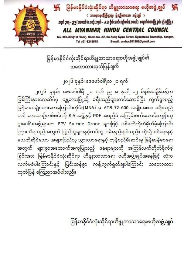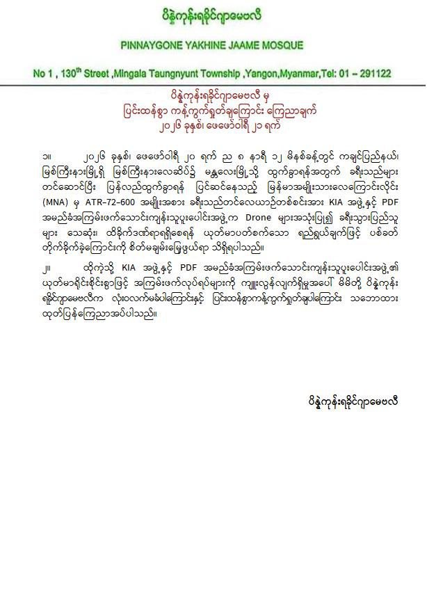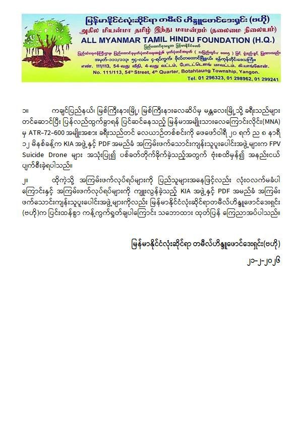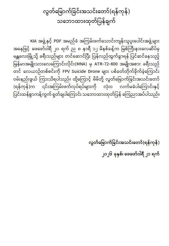 အကြမ်းဖက်အဖွဲ့များအနေဖြင့် စစ်ရေးနှင့်မသက်ဆိုင်သည့် အများပြည်သူ အသုံးပြုလျက်ရှိသော အရပ်ဘက်လေကြောင်းလိုင်းအား ရည်ရွယ်ချက်ရှိစွာဖြင့် တိုက်ခိုက်ခဲ့ခြင်းသည် ဂျီနီဗာကွန်ဗန်းရှင်းများနှင့် အပြည်ပြည်ဆိုင်ရာဥပဒေတို့အရ စစ်ရာဇဝတ်မှု (War Crime) ကို ကျူးလွန်ခြင်းဖြစ်ပြီး ၎င်းတို့၏ အကြမ်းဖက်လုပ်ရပ်များအပေါ် ဒေသခံပြည်သူများအပြင် တစ်နိုင်ငံလုံးရှိ ပြည်သူလူထုတစ်ရပ်လုံးကပါ လုံးဝလက်ခံနိုင်ခြင်းမရှိဘဲ စက်ဆုတ်ရွံရှာစွာ ဝိုင်းဝန်းကန့်ကွက်ရှုတ်ချလျက်ရှိသည်။