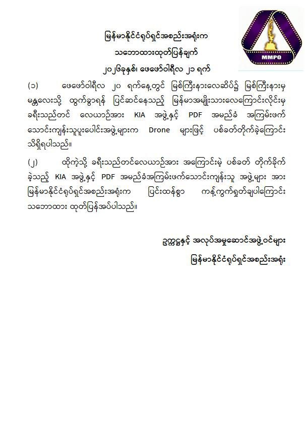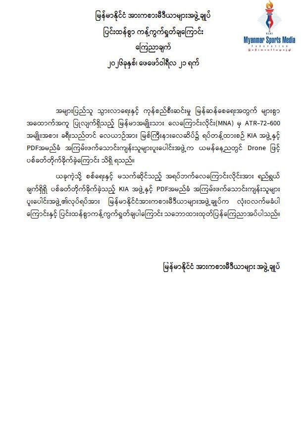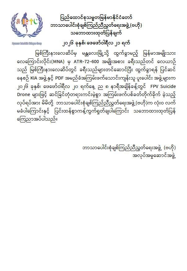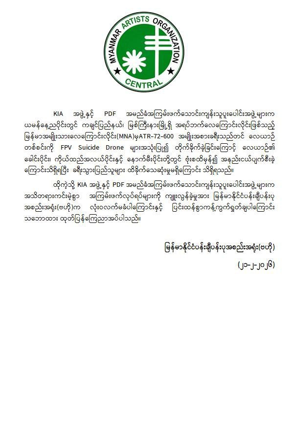 အဆိုပါ ကချင်ပြည်နယ်၏ အဓိကလေကြောင်းဗဟိုချက်တစ်ခုဖြစ်သော အများပြည်သူသွားလာရေးနှင့် ကုန်စည်စီးဆင်မှုမြန်ဆန်စေရေးအတွက် များစွာအထောက်အကူပြုလျက်ရှိသည့် မြစ်ကြီးနားလေဆိပ်အား KIA အဖွဲ့နှင့် PDFအမည်ခံ အကြမ်းဖက် သောင်းကျန်းသူပူးပေါင်းအဖွဲ့များက ဖေဖော်ဝါရီ ၂၀ ရက် ည ၈ နာရီ ၁၂ မိနစ်ခန့်တွင် FPV Suicide Drone များအသုံးပြု၍ ခရီးသွားပြည်သူများ သေဆုံး၊ ထိခိုက်ဒဏ်ရာရရှိစေရန် ယုတ်မာပက်စက်သော ရည်ရွယ်ချက်ဖြင့် ပစ်ခတ်တိုက်ခိုက်ခဲ့သဖြင့် မြန်မာအမျိုးသားလေကြောင်းလိုင်း (MNA) မှ မြစ်ကြီးနားလေဆိပ်မှ မန္တလေးမြို့သို့ ထွက်ခွာရန်အတွက် ခရီးသည်များတင်ဆောင်ပြီး ပြန်လည်ထွက်ခွာရန် ပြင်ဆင်နေသည့် ATR-72-600 အမျိုးအစား ခရီးသည်တင်လေယာဉ်၏ ခေါင်းပိုင်း၊ ကိုယ်ထည်အလယ်ပိုင်းနှင့် နောက်မီးပိုင်းတို့တွင် ဗုံးစထိမှန်ပျက်စီးခဲ့ပြီး လေယာဉ်ခရီးစဉ်ရပ်နားခဲ့ရသည်။