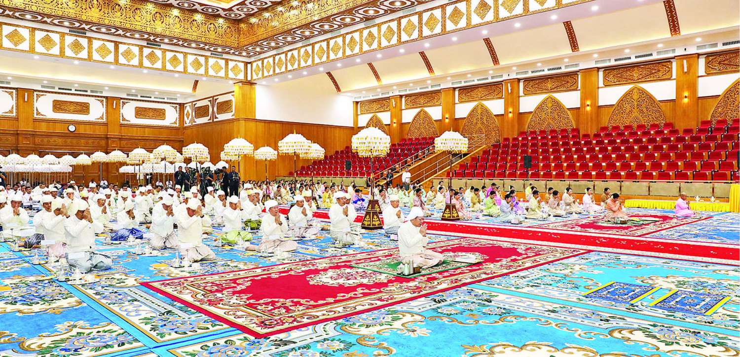 ၂၀၂၆ ခုနှစ် သာသနာတော်ဆိုင်ရာ ဘွဲ့တံဆိပ်တော်များ ဆက်ကပ်ပူဇော်ခြင်း မဟာမင်္ဂလာအခမ်းအနားနှင့် ဆွမ်းဆန်စိမ်းလောင်းလှူပွဲအခမ်းအနားကို ယနေ့မွန်းလွဲပိုင်းတွင် နေပြည်တော်၊ မာရဝိဇယဗုဒ္ဓဥယျာဉ်တော် ပရိဝုဏ်အတွင်းရှိ အဂ္ဂါဓိပတိသာသနာ့ဗိမာန်တော်ကြီးအတွင်း၌ ဆင်ယင်ကျင်းပရာ ပြည်ထောင်စုသမ္မတမြန်မာ နိုင်ငံတော်ယာယီသမ္မတ နိုင်ငံတော်လုံခြုံရေးနှင့်အေးချမ်းသာယာရေးကော်မရှင်ဥက္ကဋ္ဌ ဗိုလ်ချုပ်မှူးကြီး မင်းအောင်လှိုင်နှင့်ဇနီး ဒေါ်ကြူကြူလှတို့ တက်ရောက်ကြည်ညို၍ သာသနာတော်ဆိုင်ရာဘွဲ့တံဆိပ်တော်များ ဆက်ကပ်ပူဇော်ပြီး ဆွမ်းဆန်စိမ်းများနှင့် လှူဖွယ်ဝတ္ထုပစ္စည်းများ လောင်းလှူကြသည်။