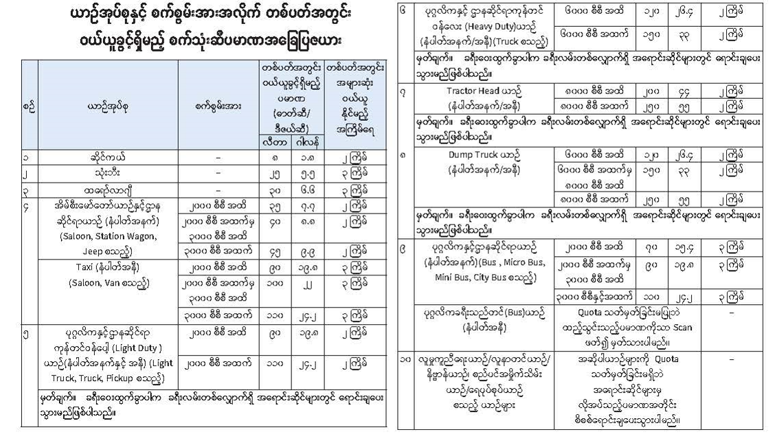 ခရီးဝေးပြေးဆွဲနေသည့် အထူးဘတ်စ်ကား၊ လူမှုကူညီရေးယာဉ်၊ လူနာတင်ယာဉ်၊ နိဗ္ဗာန်ယာဉ်၊ စည်ပင်အမှိုက်သိမ်းယာဉ်၊ ရေပုပ်စုပ်ယာဉ် စသည့်ယာဉ်များကို Quota များ သတ်မှတ်ခြင်းမရှိဘဲ အရောင်းဆိုင်များမှ လိုအပ်သည့်ပမာဏအတိုင်း စိစစ်ရောင်းချပေးသွားပါမည်။ Scan ဖတ်၍ မှတ်တမ်းတင်ထားပြီး Online Monitoring စနစ်ဖြင့် ကြပ်မတ်ထိန်းကျောင်းသွားပါမည်။