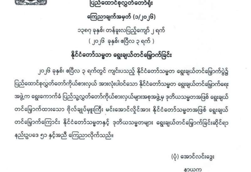 ထို့နောက် ပြည်ထောင်စုလွှတ်တော် နာယကက နိုင်ငံတော်သမ္မတ ရွေးချယ်တင်မြှောက်ပွဲ အစီအစဉ်များကို လွှတ်တော်သို့ အသိပေးကြေညာသည်။