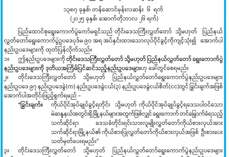 တိုင်းဒေသကြီးလွှတ်တော် သို့မဟုတ် ပြည်နယ်လွှတ်တော်ရွေးကောက်ပွဲနည်းဥပဒေများ ပြင်ဆင်ထုတ်ပြန်