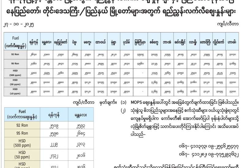 ရန်ကုန်မြို့နှင့် မန္တလေးမြို့အတွက် ရည်ညွှန်းလက်ကားဈေးနှုန်းများနှင့် ပြည်ထောင်စုနယ်မြေနေပြည်တော်၊ တိုင်းဒေသကြီး/ပြည်နယ် မြို့တော်များအတွက် ရည်ညွှန်းလက်လီစျေးနှုန်းများ
