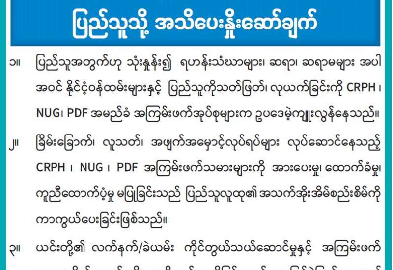 အကြမ်းဖက်အုပ်စုအဖြစ်ကြေညာထားသော CRPH၊ NUG နှင့် ယင်းတို့၏ လက်ဝေခံ အဖွဲ့အစည်းများ၊ ယင်းတို့နှင့် ဆက်နွှယ်နေသော အဖွဲ့အစည်းများ၊ လူပုဂ္ဂိုလ်များသည် နိုင်ငံတော် တည်ငြိမ်အေးချမ်းရေးကို ပျက်ပြားစေရန်နှင့် ပြည်သူလူထုကို အကြောက်တရားများ ဖြစ်ပေါ်စေပြီး အစိုးရယန္တရားများ ပျက်ပြားစေရန် ရည်ရွယ်လျက်လှုံ့ဆော်ခြင်း၊ ဝါဒဖြန့်ခြင်း၊ ခြိမ်းခြောက်ခြင်းများကို လူမှုကွန်ရက်များမှတစ်ဆင့် နည်းမျိုးစုံဖြင့် ပြုလုပ်လျက်ရှိပါသည်။