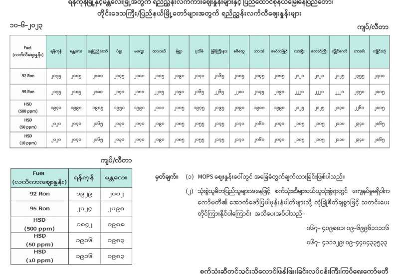 ရန်ကုန်မြို့နှင့် မန္တလေးမြို့အတွက် ရည်ညွှန်းလက်ကားဈေးနှုန်းများနှင့် ပြည်ထောင်စုနယ်မြေ နေပြည်တော်၊ တိုင်းဒေသကြီး/ ပြည်နယ် မြို့တော်များအတွက် ရည်ညွှန်းလက်လီဈေးနှုန်းများ