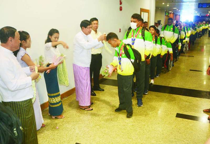 ကမ္ဘောဒီးယားနိုင်ငံ ဖနောင်ပင်မြို့ တွင် ဇွန် ၃ ရက်မှ ၉ ရက်အထိ ကျင်းပခဲ့သည့် (၁၂) ကြိမ်မြောက် အာဆီယံ မသန်စွမ်းသူများ အားကစားပြိုင်ပွဲတွင် ရွှေ ၁၅ ခု၊ ငွေ ၂၂ ခု၊ ကြေး ၁၉ ခု စုစုပေါင်း ဆုတံဆိပ် ၅၆ ခု ဆွတ်ခူးရရှိခဲ့သော မြန်မာမသန်စွမ်းအားကစားအဖွဲ့သည် ယနေ့ညပိုင်းက မြန်မာအမျိုးသား လေကြောင်းလိုင်းစင်းလုံးငှားလေယာဉ်ဖြင့် ပြန်လည်ရောက်ရှိလာရာ ရန်ကုန်တိုင်းဒေသကြီးဝန်ကြီးချုပ် ဦးစိုးသိန်း၊ အားကစားနှင့်လူငယ်ရေးရာဝန်ကြီးဌာန ဒုတိယဝန်ကြီးဦးမျိုးလှိုင်၊ တိုင်းဒေသကြီးဝန်ကြီး များ၊ အားကစားနှင့်ကာယပညာဦးစီးဌာနမှတာဝန်ရှိသူများ၊ မြန်မာနိုင်ငံမသန်စွမ်းသူများ အားကစားအဖွဲ့ချုပ်မှ တာဝန်ရှိသူများ၊ အားကစားနှင့်ကာယပညာ သိပ္ပံ (ရန်ကုန်)မှ ကျောင်းသား ကျောင်းသူများ၊ အားကစားသမားများ၊ မိဘဆွေမျိုးများက ရန်ကုန်အပြည်ပြည်ဆိုင်ရာလေဆိပ်၌ ကြိုဆိုနှုတ်ဆက်ကြသည်။