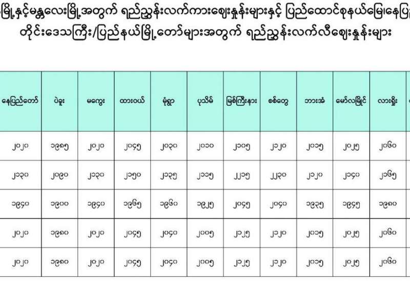 ရန်ကုန်မြို့နှင့် မန္တလေးမြို့အတွက် ရည်ညွှန်းလက်ကားဈေးနှုန်းများနှင့် ပြည်ထောင်စုနယ်မြေ နေပြည်တော်၊ တိုင်းဒေသကြီး/ ပြည်နယ် မြို့တော်များအတွက် ရည်ညွှန်းလက်လီဈေးနှုန်းများ