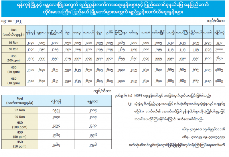 ရန်ကုန်မြို့နှင့် မန္တလေးမြို့အတွက် ရည်ညွှန်းလက်ကားဈေးနှုန်းများနှင့် ပြည်ထောင်စုနယ်မြေ နေပြည်တော်၊ တိုင်းဒေသကြီး/ပြည်နယ် မြို့တော်များအတွက် ရည်ညွှန်းလက်လီဈေးနှုန်းများ