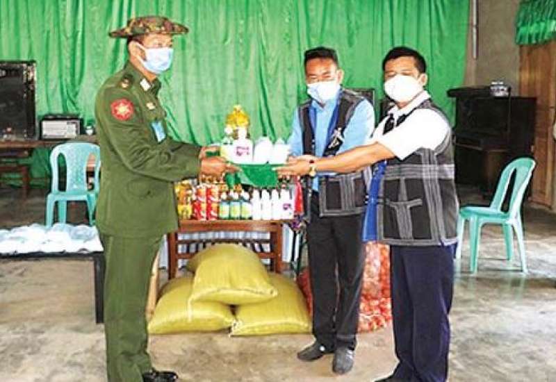 ကိုဗစ်- ၁၉ ရောဂါ ကာကွယ်၊ ထိန်းချုပ်၊ ကုသရေးလုပ်ငန်းများတွင် အသုံး ပြုရန်အတွက် တပ်မတော်သားများနှင့် စေတနာရှင်အလှူရှင်များက ကျန်းမာရေး အထောက်အကူပြုပစ္စည်းများနှင့် အလှူငွေများ ပေးအပ် လှူဒါန်းလျက်ရှိသည်။