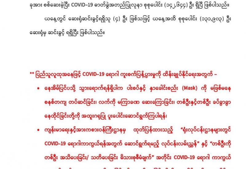 ဆက်လက်ထိန်းသိမ်းကာကွယ် မြန်မာနိုင်ငံတွင် အသက်ရှူလမ်းကြောင်းဆိုင်ရာ ကိုဗစ်-၁၉ ကူးစက် ရောဂါမဖြစ်ပွားအောင် ကာကွယ်၊ ထိန်းချုပ်၊ ကုသပေးလျက်ရှိသည်။ ကိုဗစ်-၁၉ ကပ်ရောဂါသည် ၂၀၂၀ ပြည့်နှစ်တစ်နှစ်လုံး ကမ္ဘာတစ်ခွင် ကူးစက်ပြန့်ပွားခဲ့ပြီး ၂၀၂၁ ခုနှစ်တွင်လည်း ပြီးဆုံးခြင်းမရှိသေးပေ။ ယခုအခါ ကမ္ဘာပေါ်ရှိနိုင်ငံများတွင် ကိုဗစ်-၁၉ တတိယလှိုင်း ဖြစ်ပေါ်လာပြီးတစ် ကမ္ဘာလုံး ဆိုင်ရာ ကိုဗစ်-၁၉ကူးစက်မှုနှုန်းအမြင့်ဆုံးအနေအထား သို့ နီးကပ်လာကြောင်း ကမ္ဘာ့ကျန်းမာရေး အဖွဲ့ကြီး က ဧပြီလ ၁၆ ရက်နေ့က အသိ ပေးထားသည်။