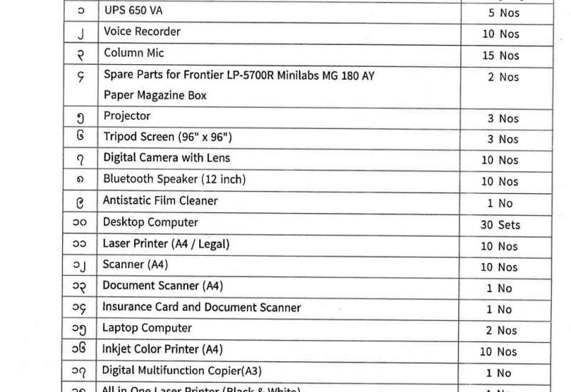 ပြန်ကြားရေးဝန်ကြီးဌာန ပြန်ကြားရေးနှင့်ပြည်သူ့ဆက်ဆံရေးဦးစီးဌာန အခြားရုံးသုံးပစ္စည်းနှင့် ရုံးသုံးစက်ကိရိယာများ ဝယ်ယူရန် အိတ်ဖွင့်တင်ဒါခေါ်ယူခြင်း