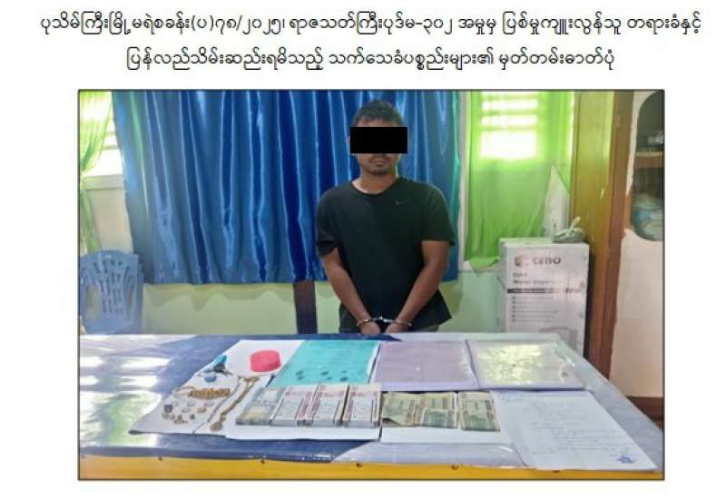မန္တလေးတိုင်းဒေသကြီး၊ ပုသိမ်ကြီးမြို့နယ်၌ ဧပြီလ ၂၇ ရက်နေ့က အငြိမ်းစားပါမောက္ခ အမျိုးသမီး ၁ ဦးအား သတ်ဖြတ်မှုကျူးလွန်ခဲ့သူ တရားခံအမျိုးသား ၁ ဦးအား ဖော်ထုတ်ဖမ်းဆီးရမိခဲ့ကြောင်း သိရသည်။