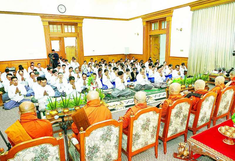 လူမှုဝန်ထမ်း၊ ကယ်ဆယ်ရေးနှင့် ပြန်လည်နေရာချထားရေးဝန်ကြီးဌာန ပြည်ထောင်စုဝန်ကြီး ဒေါက်တာစိုးဝင်းသည် ဒုတိယဝန်ကြီး၊ အမြဲတမ်းအတွင်းဝန်၊ ညွှန်ကြားရေးမှူးချုပ်များ၊ ဝန်ကြီး ဌာနမှ ဝန်ထမ်းများနှင့်အတူ ယနေ့ညနေ ၄ နာရီတွင် ဝန်ကြီး ဌာနဝင်းအတွင်း၌ နှစ်ဆန်း တစ်ရက်နေ့ အန္တရာယ်ကင်း ပရိတ်တရားနာ ရွတ်ဖတ်ပူဇော်ခြင်းကိုပြုလုပ်ရာ ဆရာဒကာ၊ ကျောင်းတိုက်လေးခုမှ သံဃာ တော်ကိုးပါးက အန္တရာယ်ကင်း ပရိတ်တရားများ ရွတ်ဖတ်ပေး သည်။ ထို့နောက် ပြည်ထောင်စု ဝန်ကြီး ဒေါက်တာ စိုးဝင်း၊ ဒုတိယဝန်ကြီးနှင့် တာဝန်ရှိသူများက သံဃာတော်များအား လှူဖွယ်ပစ္စည်းများ ဖြစ်သည့် ဆန်၊ ဆီ၊ ဆား၊ ငရုတ်၊ကြက်သွန် အပါအဝင်ဝတ္ထုငွေများ ဆက်ကပ် လှူဒါန်းကြသည်။