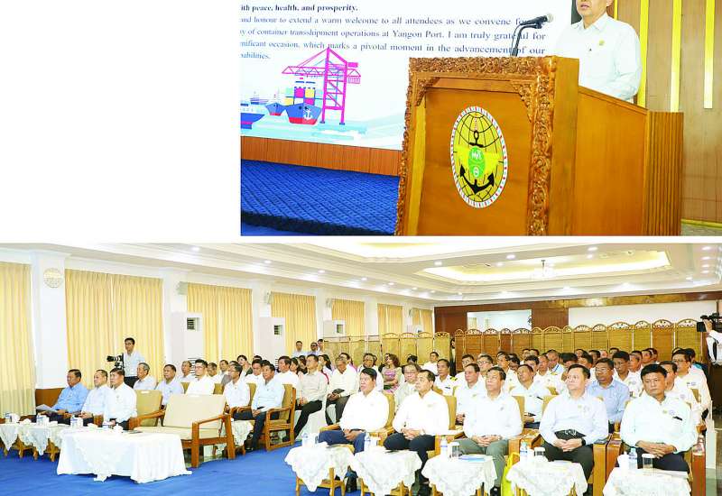 ပို့ဆောင်ရေးနှင့်ဆက်သွယ်ရေးဝန်ကြီးဌာန မြန်မာ့ဆိပ်ကမ်းအာဏာပိုင်မှ ဦးဆောင်ပြုလုပ်သည့် ပထမအကြိမ် ရေယာဉ်လွှဲပြောင်းတင်ဆောင်ခြင်း (Trans- shipment) လုပ်ငန်းစဉ်စတင်ခြင်း အခမ်းအနားကို ယမန်နေ့က ရန်ကုန်တိုင်းဒေသကြီး အလုံမြို့နယ်ရှိ Asia World Port Terminal (AWPT) ဆိပ်ကမ်းတံတား၌ ကျင်းပသည်။
