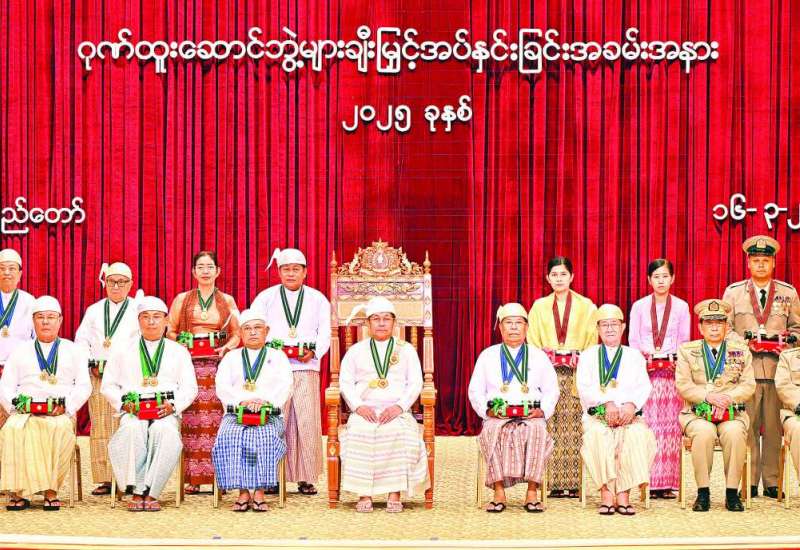 ၂၀၂၅ ခုနှစ်၊ ဂုဏ်ထူးဆောင်ဘွဲ့များ ချီးမြှင့်အပ်နှင်းခြင်းအခမ်းအနားကို ယနေ့နံနက်ပိုင်းတွင် နိုင်ငံတော်စီမံအုပ်ချုပ်ရေးကောင်စီဥက္ကဋ္ဌရုံး၊ သဘင်ဆောင်၌ကျင်းပရာ နိုင်ငံတော်စီမံအုပ်ချုပ်ရေးကောင်စီဥက္ကဋ္ဌ နိုင်ငံတော်ဝန်ကြီးချုပ် ဗိုလ်ချုပ်မှူးကြီး သတိုးမဟာသရေစည်သူ သတိုးသီရိသုဓမ္မမင်းအောင်လှိုင် တက်ရောက်အမှာစကားပြောကြားပြီး ဂုဏ်ထူးဆောင်ဘွဲ့များချီးမြှင့်အပ်နှင်းသည်။
