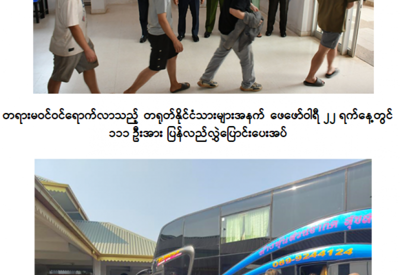 နိုင်ငံတော်အစိုးရအနေဖြင့် အွန်လိုင်းလိမ်လည်မှု (Telecom Fraud) နှင့် ဒုစရိုက်မှုလုပ်ငန်းများကို အိမ်နီးချင်းနိုင်ငံများအပါအဝင် နိုင်ငံတကာမှအဖွဲ့အစည်းများနှင့် ပူးပေါင်း၍ ပြတ်ပြတ်သားသား စုံစမ်းဖော်ထုတ်တိုက်ဖျက်လျက်ရှိပြီး အဆိုပါလုပ်ငန်းများတွင် ဆက်စပ်ပါဝင်ခဲ့ကြသည့် ပြည်ပနိုင်ငံသားများကို သက်ဆိုင်ရာနိုင်ငံများသို့ စနစ်တကျလွှဲပြောင်းပေးလျက်ရှိရာ ယနေ့တွင် တရုတ်နိုင်ငံသား (၁၁၁)ဦးကို မြန်မာ-ထိုင်း အမှတ်(၂) ချစ်ကြည်ရေးတံတားမှတစ်ဆင့် သက်ဆိုင်ရာနိုင်ငံသို့လည်းကောင်း၊ ထိုင်းနိုင်ငံသား (၁)ဦးကို မြန်မာ-ထိုင်း အမှတ်(၁) ချစ်ကြည်ရေးတံတားမှတစ်ဆင့် သက်ဆိုင်ရာနိုင်ငံသို့လည်းကောင်း လူသားချင်းစာနာထောက်ထားမှုနှင့် နိုင်ငံအချင်းချင်း ချစ်ကြည်ရင်းနှီးမှုတို့ကိုရှေးရှု၍ ဥပဒေလုပ်ထုံးလုပ်နည်းများနှင့်အညီ ပြည်နှင်လွှဲပြောင်းပေးခဲ့သည်။