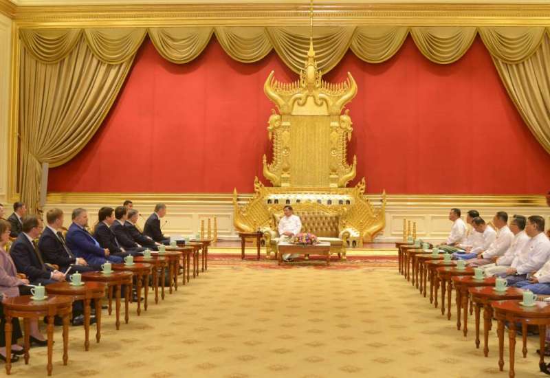 နိုင်ငံတော်စီမံအုပ်ချုပ်ရေးကောင်စီဥက္ကဋ္ဌ နိုင်ငံတော်ဝန်ကြီးချုပ် ဗိုလ်ချုပ်မှူးကြီး မင်းအောင်လှိုင်ထံသို့ ရုရှားဖက်ဒရေးရှင်းနိုင်ငံ၊ စီးပွားရေးဖွံ့ဖြိုးတိုးတက်မှုဝန်ကြီးဌာန၊ ဝန်ကြီး H.E. Maxim RESHETNIKOV ဦးဆောင်သည့်အဖွဲ့ဝင်များက ယနေ့မွန်းလွဲပိုင်းတွင် နိုင်ငံတော်စီမံအုပ်ချုပ်ရေးကောင်စီဥက္ကဋ္ဌရုံး၊ သံတမန်ဆောင်ဧည့်ခန်းမ၌ လာရောက်ဂါရဝပြုတွေ့ဆုံသည်။