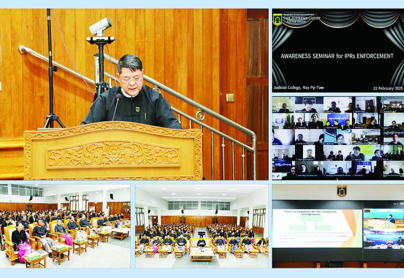 မူပိုင်ခွင့်ဆိုင်ရာဗဟိုကော်မတီ၏ အမျိုးသားအဆင့်မူပိုင်ခွင့်ဆိုင်ရာမဟာဗျူဟာ ၄.၈ အရ မူပိုင်ခွင့်မှုခင်းများအား စစ်ဆေးစီရင်မည့် တရားသူကြီးနှင့် တရားရေးအရာရှိများကို မူပိုင်ခွင့်ဆိုင်ရာ အသိပညာများဖြန့်ဝေပို့ချပေးရန်၊ မဟာဗျူဟာ ၆ အရ မူပိုင်ခွင့်ချိုးဖောက်မှုများကို တားဆီးကာကွယ်နိုင်စေခြင်းငှာ သက်ဆိုင်ရာတရားသူကြီးများကို လေ့ကျင့်သင်ကြားပေးရန်နှင့် ပြည်ထောင်စုတရားလွှတ်တော်ချုပ်၏ မဟာဗျူဟာရည်မှန်းချက် ၅.၂ ပါ မူပိုင်ခွင့်ဥပဒေများနှင့် စပ်လျဉ်းသည့် အသိပညာပေးအစီအစဉ်များဆောင်ရွက်ရန် ရည်ရွယ်၍ မူပိုင်ခွင့်ချိုးဖောက်မှုများ တားဆီးကာကွယ်ရေးဆိုင်ရာ အသိပညာပေးဆွေးနွေးပွဲ (Awareness Seminar for the Enforcement of Intellectual Property Rights)ကို ယနေ့မွန်းလွဲ ၁၂ နာရီခွဲတွင် ပြည်ထောင်စုတရားလွှတ်တော်ချုပ် Judicial College ၌ ပူးတွဲစနစ် (In-person/Virtual) ဖြင့် ကျင်းပရာ ပြည်ထောင်စုတရားသူကြီးချုပ် ဦးသာဌေး တက်ရောက်အမှာစကားပြောကြားသည်။