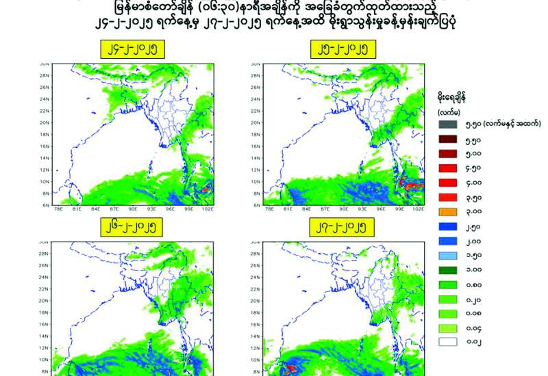 ယနေ့မြန်မာစံတော်ချိန် ညနေ ၄ နာရီခွဲ တိုင်းထွာချက်များအရ ကပ္ပလီပင်လယ်ပြင်နှင့် ဘင်္ဂလားပင်လယ်အော်တို့မှ လေနွေးများနှင့် တရုတ်ပြည်မကြီးပေါ်ရှိ လေဖိအားကြီးရပ်ဝန်းဒေသမှ ရွေ့လျားလာသော လေအေးများ တွေ့ဆုံမှုကြောင့် လည်းကောင်း၊ အနောက်ဘက်မှ ရွေ့လျားလာသော လေပွေလှိုင်းများ၏ အရှိန်ကြောင့်လည်းကောင်း၊ အရှေ့ဘက်မှရွေ့လျားလာသော လေပွေလှိုင်းများ၏ အရှိန်ကြောင့်လည်းကောင်း ဖေဖော်ဝါရီ ၂၄ ရက်မှ ၂၇ ရက်အတွင်း နေပြည်တော်၊ ရန်ကုန်တိုင်းဒေသကြီး၊ ပဲခူးတိုင်းဒေသကြီး၊ ဧရာဝတီတိုင်းဒေသကြီး၊