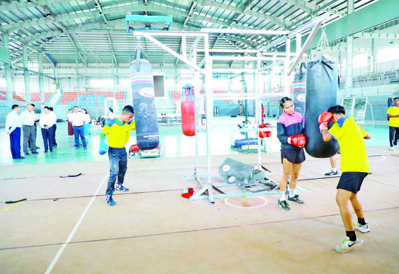 မြန်မာနိုင်ငံ အိုလံပစ်ကော်မတီဥက္ကဋ္ဌ အားကစားနှင့်လူငယ်ရေးရာဝန်ကြီးဌာနနှင့် ဟိုတယ်နှင့်ခရီးသွားလာရေးဝန်ကြီးဌာန ပြည်ထောင်စုဝန်ကြီး Jeng Phang နော်တောင်သည် အားကစားနှင့်လူငယ်ရေးရာဝန်ကြီးဌာန ဒုတိယဝန်ကြီး ဦးဇင်မင်းထက်၊ တာဝန်ရှိသူများနှင့်အတူ ယနေ့ နံနက်ပိုင်းတွင် (၃၃)ကြိမ်မြောက် အရှေ့တောင်အာရှအားကစားပြိုင်ပွဲသို့ ဝင်ရောက်ယှဉ်ပြိုင်ရန် လက်ဝှေ့နှင့်ပိုက်ကျော်ခြင်းအားကစားအဖွဲ့များ စခန်းဝင်လေ့ကျင့်နေမှုကို ကြည့်ရှုအားပေးသည်။