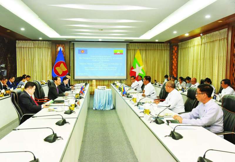 ဒုတိယဝန်ကြီးချုပ်နှင့် နိုင်ငံခြားရေးဝန်ကြီးဌာန ပြည်ထောင်စုဝန်ကြီး ဦးသန်းဆွေ ဦးဆောင်သော မြန်မာကိုယ်စားလှယ်အဖွဲ့နှင့် အာဆီယံအလှည့်ကျဥက္ကဋ္ဌ၏ မြန်မာနိုင်ငံဆိုင်ရာ အထူးကိုယ်စားလှယ် H.E. Mr. Alounkeo KITTIKHOUN ဦးဆောင်သည့် ကိုယ်စားလှယ်အဖွဲ့တို့အကြား ပူးတွဲအစည်းအဝေးတစ်ရပ်ကို ယနေ့မွန်းလွဲ ၁ နာရီခွဲတွင် နေပြည်တော်ရှိ နိုင်ငံခြားရေးဝန်ကြီးဌာန၌ ကျင်းပသည်။