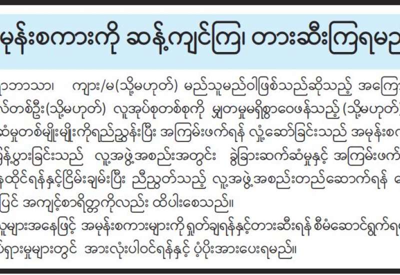 မြန်မာနိုင်ငံအမျိုးသားလူ့အခွင့်အရေးကော်မရှင်၏ အသိပညာမျှဝေခြင်း အစီအစဉ်(Knowledge Sharing Program)အရ “လုပ်ငန်းခွင်အတွင်း စိတ်ဖိစီးမှုလျှော့ချရေးနှင့် လုပ်ငန်းခွင်သာယာရေး” ခေါင်းစဉ်ဖြင့် အသိပညာပေးဆွေးနွေးဟောပြောပွဲကို ယနေ့နံနက် ၁၀ နာရီတွင် မြန်မာနိုင်ငံအမျိုးသားလူ့အခွင့်အရေးကော်မရှင်ရုံး Conference Room ၌ ကျင်းပသည်။