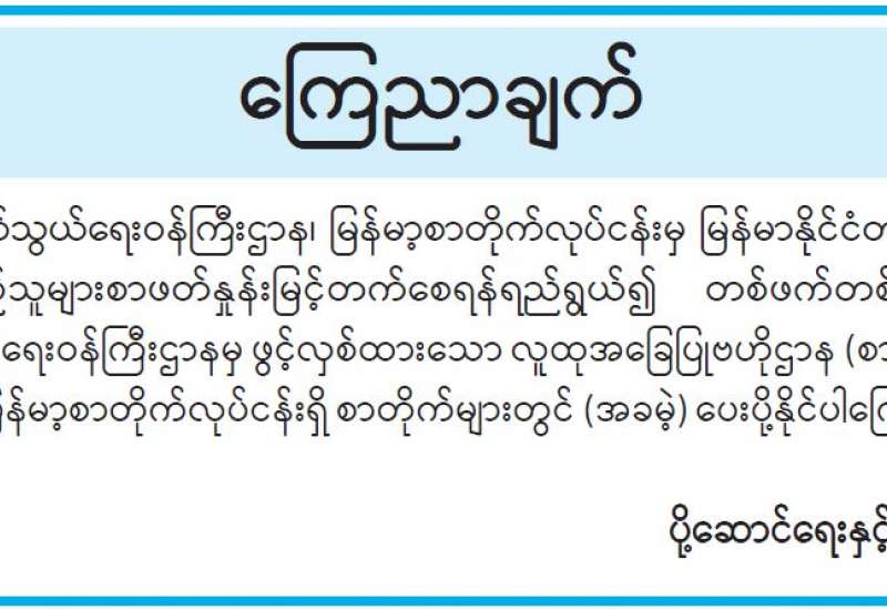ပို့ဆောင်ရေးနှင့်ဆက်သွယ်ရေးဝန်ကြီးဌာန၊ မြန်မာ့စာတိုက်လုပ်ငန်းမှ မြန်မာနိုင်ငံတစ်ဝန်းရှိ စာကြည့်တိုက်များ ဖွံ့ဖြိုးတိုးတက်ရေးနှင့် ပြည်သူများစာဖတ်နှုန်းမြင့်တက်စေရန်ရည်ရွယ်၍ တစ်ဖက်တစ်လမ်းမှ ပါဝင်ဝန်ဆောင်မှုပေးသည့်အနေဖြင့် ပြန်ကြားရေးဝန်ကြီးဌာနမှ ဖွင့်လှစ်ထားသော လူထုအခြေပြုဗဟိုဌာန (စာကြည့်တိုက်) များသို့ စာအုပ်များပေးပို့လှူဒါန်းလိုပါက မြန်မာ့စာတိုက်လုပ်ငန်းရှိ စာတိုက်များတွင် (အခမဲ့) ပေးပို့နိုင်ပါကြောင်း ကြေညာအပ်ပါသည်။
