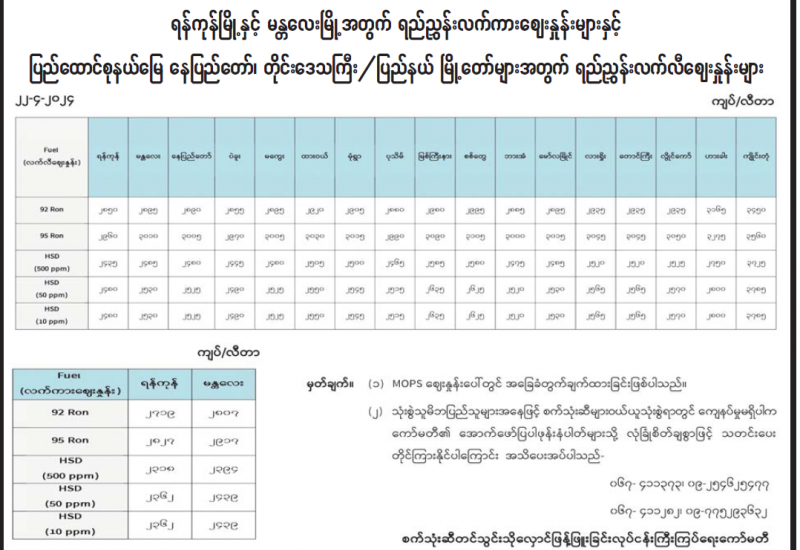 ရန်ကုန်မြို့နှင့် မန္တလေးမြို့အတွက် ရည်ညွှန်းလက်ကားဈေးနှုန်းများနှင့် ပြည်ထောင်စုနယ်မြေ နေပြည်တော်၊ တိုင်းဒေသကြီး/ပြည်နယ် မြို့တော်များအတွက် ရည်ညွှန်းလက်လီဈေးနှုန်းများ