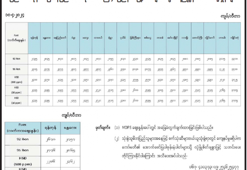 ရန်ကုန်မြို့နှင့် မန္တလေးမြို့အတွက် ရည်ညွှန်းလက်ကားဈေးနှုန်းများနှင့် ပြည်ထောင်စုနယ်မြေ နေပြည်တော်၊ တိုင်းဒေသကြီး/ပြည်နယ် မြို့တော်များအတွက် ရည်ညွှန်းလက်လီဈေးနှုန်းများ