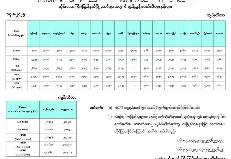 ရန်ကုန်မြို့နှင့် မန္တလေးမြို့အတွက် ရည်ညွှန်းလက်ကားဈေးနှုန်းများနှင့် ပြည်ထောင်စုနယ်မြေ နေပြည်တော်၊ တိုင်းဒေသကြီး/ပြည်နယ် မြို့တော်များအတွက် ရည်ညွှန်းလက်လီဈေးနှုန်းများ