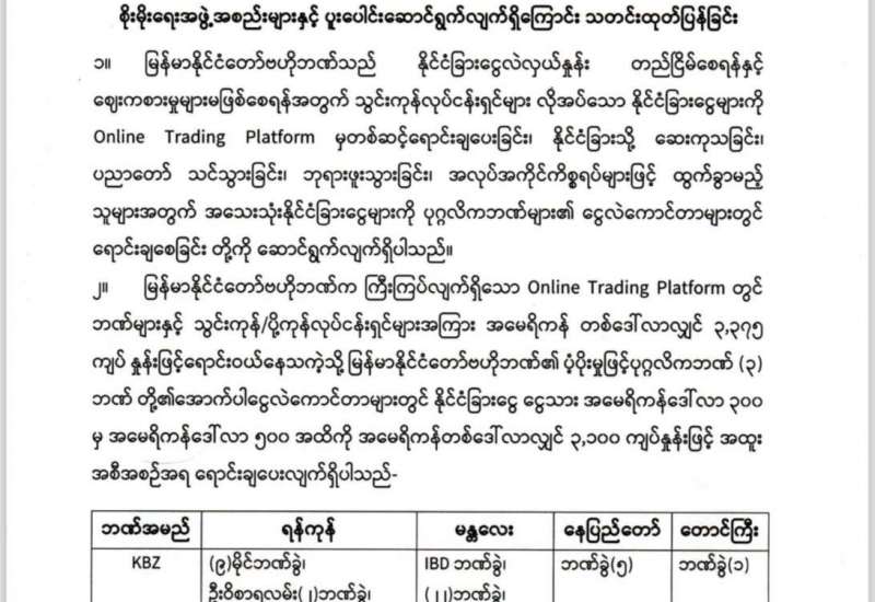 မဟုတ်မမှန်လုပ်ကြံသတင်းများ ထုတ်ပြန်ပြီး နိုင်ငံခြားငွေလဲလှယ်နှုန်းများ မြင့်တက်စေရန် လှုံ့ဆော်သူများကို တည်ဆဲဥပဒေများနှင့်အညီ တရားစွဲအရေးယူနိုင်ရေးအတွက် တရားဥပဒေ စိုးမိုးရေးအဖွဲ့အစည်းများနှင့် ပူးပေါင်းဆောင်ရွက်လျက်ရှိကြောင်း သတင်းထုတ်ပြန်ခြင်း