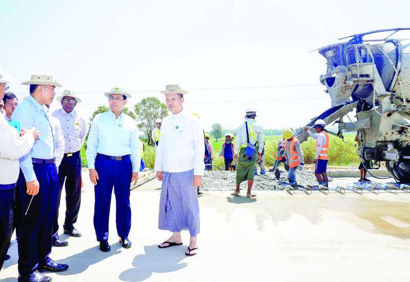 ဆောက်လုပ်ရေးဝန်ကြီးဌာန ပြည်ထောင်စုဝန်ကြီးဦးမျိုးသန့်သည် တာဝန်ရှိသူများနှင့်အတူ ယနေ့တွင် ရန်ကုန် - ပုသိမ်လမ်းပိုင်း ပြုပြင်ထိန်းသိမ်းရေးလုပ်ငန်းများ ဆောင်ရွက်နေမှုကို ကြည့်ရှုစစ်ဆေးသည်။