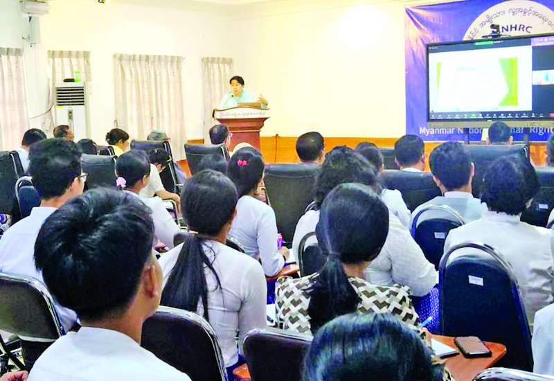 မြန်မာနိုင်ငံအမျိုးသားလူ့အခွင့်အရေးကော်မရှင်၏ အသိပညာမျှဝေခြင်းအစီအစဉ်အရ “ကောင်းမွန်သောအုပ်ချုပ်မှုအတွက် ပြုပြင်ပြောင်းလဲမှုဆိုင်ရာ စိန်ခေါ်မှုများကို လူ့အခွင့်အရေးရှုထောင့်မှသုံးသပ်ခြင်း - THE CHALLENGES OF REFORMS FOR GOOD GOVERNANCE FROM THE HUMAN RIGHTS POINT OF VIEW”ခေါင်းစဉ်ဖြင့် အသိပညာပေးဆွေးနွေးဟောပြောပွဲကို ယနေ့မွန်းလွဲ ၁ နာရီတွင် မြန်မာနိုင်ငံအမျိုးသားလူ့အခွင့်အရေးကော်မရှင်ရုံး Conference Room ၌ ကျင်းပသည်။