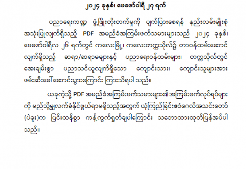 စစ်ကိုင်းတိုင်းဒေသကြီး၊ ကလေးမြို့၊ ကလေးတက္ကသိုလ်အတွင်းရှိ ဆရာ/ဆရာမများနှင့် ကျောင်းသား/ကျောင်းသူများအား ဖေဖော်ဝါရီ ၂၆ ရက်တွင် PDF အမည်ခံ အကြမ်းဖက်သမားများက ဖမ်းဆီးရန်ကြိုးစားခဲ့သဖြင့် လုံခြုံရေးတပ်ဖွဲ့ဝင်များက အချိန်မီသွားရောက်ကယ်တင်ခဲ့ရာ ဆရာ/ဆရာမ၊ ကျောင်းသား/ကျောင်းသူ ၂၈၅ ဦးအား ပြန်လည်ခေါ်ဆောင်နိုင်ခဲ့သည်။