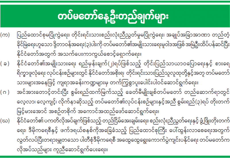 (က) ပြည်ထောင်စုမပြိုကွဲရေး၊ တိုင်းရင်းသားစည်းလုံးညီညွတ်မှုမပြိုကွဲရေး၊ အချုပ်အခြာအာဏာ တည်တံ့ခိုင်မြဲရေးဟူသော ဒို့တာဝန်အရေး (၃) ပါးကို တပ်မတော်၏ အမျိုးသားရေးမူဝါဒအဖြစ် အမြဲဦးထိပ်ပန်ဆင်ပြီး နိုင်ငံတော်အတွက် အသက်ပေးကာကွယ်စောင့်ရှောက်ရေး။