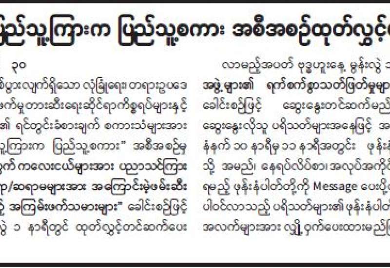 မျက်မှောက်ကာလတွင် ဖြစ်ပွားလျက်ရှိသော လုံခြုံရေး၊ တရားဥပဒေစိုးမိုးရေးနှင့် အကြမ်းဖက်မှုတားဆီးရေးဆိုင်ရာ ကိစ္စရပ်များနှင့် ပတ်သက်၍ ပရိသတ်များ၏ ရင်တွင်းခံစားချက် စကားသံများအား သဇင် FM ၏ “ပြည်သူ့ကြားက ပြည်သူ့စကား” အစီအစဉ်မှ “အနာဂတ်နိုင်ငံတော်အတွက် ကလေးငယ်များအား ပညာသင်ကြားပေးနေသည့် ကျောင်းဆရာ/ဆရာမများအား အကြောင်းမဲ့ဖမ်းဆီးသတ်ဖြတ်နှိပ်စက်နေသည့် အကြမ်းဖက်သမားများ” ခေါင်းစဉ်ဖြင့် ဇန်နဝါရီ ၃၁ ရက် မွန်းလွဲ ၁ နာရီတွင် ထုတ်လွှင့်တင်ဆက်ပေးသွားမည်ဖြစ်သည်။