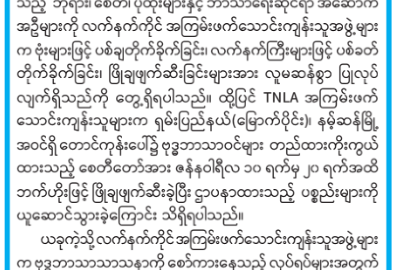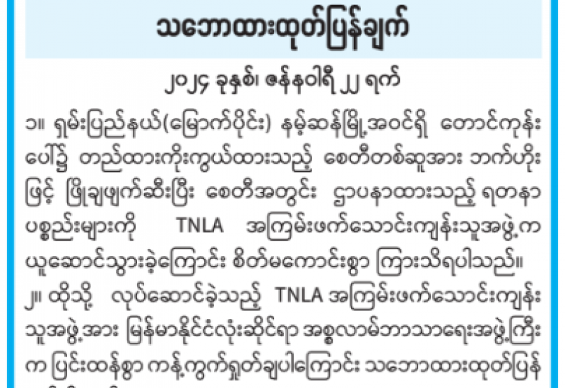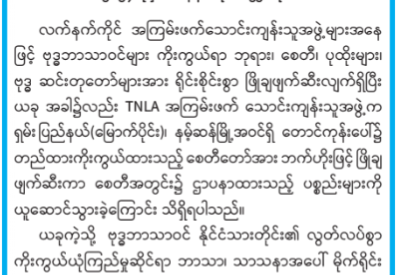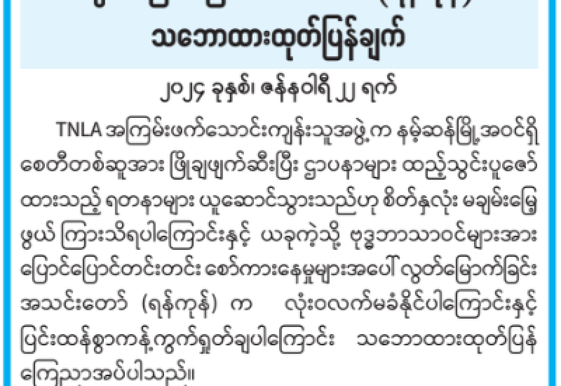 TNLA အကြမ်းဖက်သောင်းကျန်းသူအဖွဲ့က နမ့်ဆန်မြို့အဝင်ရှိ စေတီတစ်ဆူအား ဖြိုချဖျက်ဆီးပြီး ဌာပနာများ ထည့်သွင်းပူဇော်ထားသည့် ရတနာများ ယူဆောင်သွားသည်ဟု စိတ်နှလုံး မချမ်းမြေ့ဖွယ် ကြားသိရပါကြောင်းနှင့် ယခုကဲ့သို့ ဗုဒ္ဓဘာသာဝင်များအား ပြောင်ပြောင်တင်းတင်း စော်ကားနေမှုများအပေါ် လွတ်မြောက်ခြင်း အသင်းတော် (ရန်ကုန်) က လုံးဝလက်မခံနိုင်ပါကြောင်းနှင့် ပြင်းထန်စွာကန့်ကွက်ရှုတ်ချပါကြောင်း သဘောထားထုတ်ပြန် ကြေညာအပ်ပါသည်။